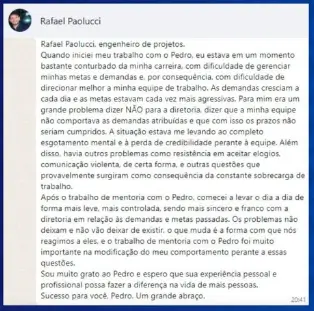 “Estava em um momento bastante conturbado da minha carreira…” “comecei a levar o dia a dia de forma mais leve, mais controlada, o trabalho de mentoria com o Pedro foi muito importante na modificação do meu comportamento profissional”